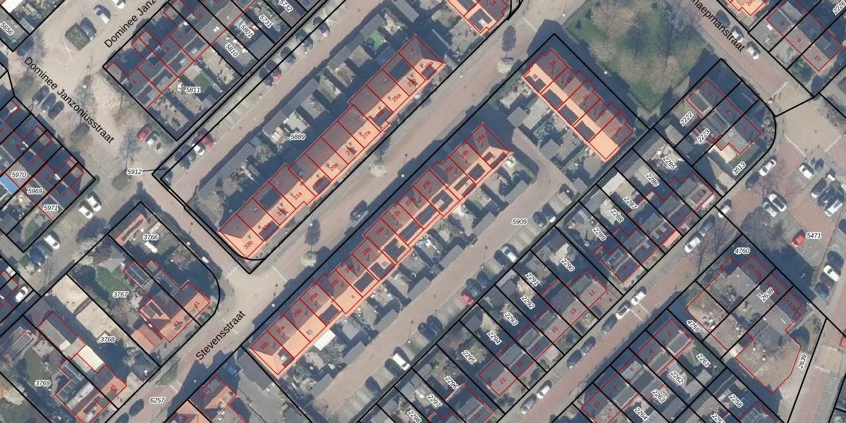 Het perceel waarop Stevensstraat 22-a staat heeft een oppervlakte van 3380 m². Dit is een zeer groot perceel. De perceeloppervlakte wordt geregistreerd door het Kadaster. Gedetailleerde informatie over de maten van dit perceel kunt u vinden in het rapport Kadastrale kaart met maatvoering van Stevensstraat 22-a.