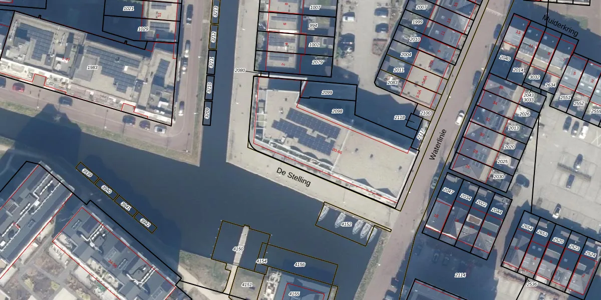 Het adres is gelegen op perceel 2098 in de sectie A en de kadastrale gemeente Muiden. De kadastrale aanduiding is aldus MDN01-A-2098. De gemiddelde perceelgrootte in Muiden is 5040,34 m². Dit perceel is kleiner: de perceeloppervlakte bedraagt 1385 m². Het grootste perceel in de kadastrale gemeente is 16,18 km². Het kleinste perceel heeft een oppervlakte van 0 m². Op het perceel liggen in totaal 24 adressen. De laatste wijziging in het de Basisregistratie Kadaster (BRK) was op 22-12-2021.