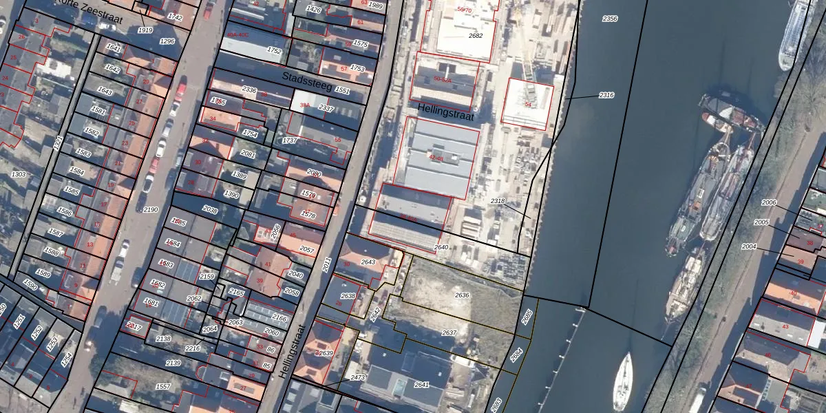 Hellingstraat 40 is gelegen op kadastraal perceel MDN01B2682. Deze kadastrale aanduiding is uniek en wordt gebruikt door het Kadaster om eigendomsrechten en andere zakelijke rechten vast te leggen. Het perceel maakt onderdeel uit van de kadastrale gemeente Muiden.