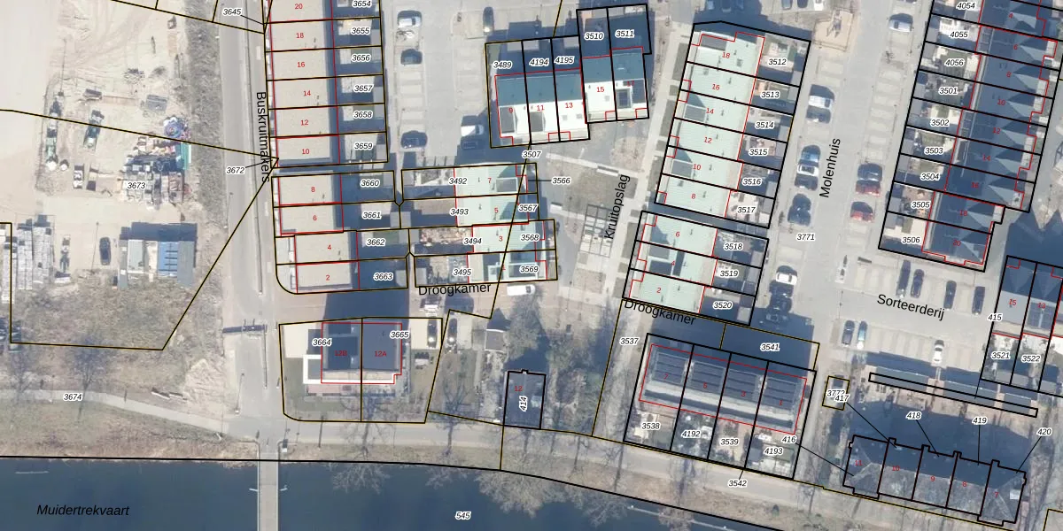 Kruitopslag 1 is gelegen op kadastraal perceel MDN01A3569. Deze kadastrale aanduiding is uniek en wordt gebruikt door het Kadaster om eigendomsrechten en andere zakelijke rechten vast te leggen. Het perceel maakt onderdeel uit van de kadastrale gemeente Muiden.