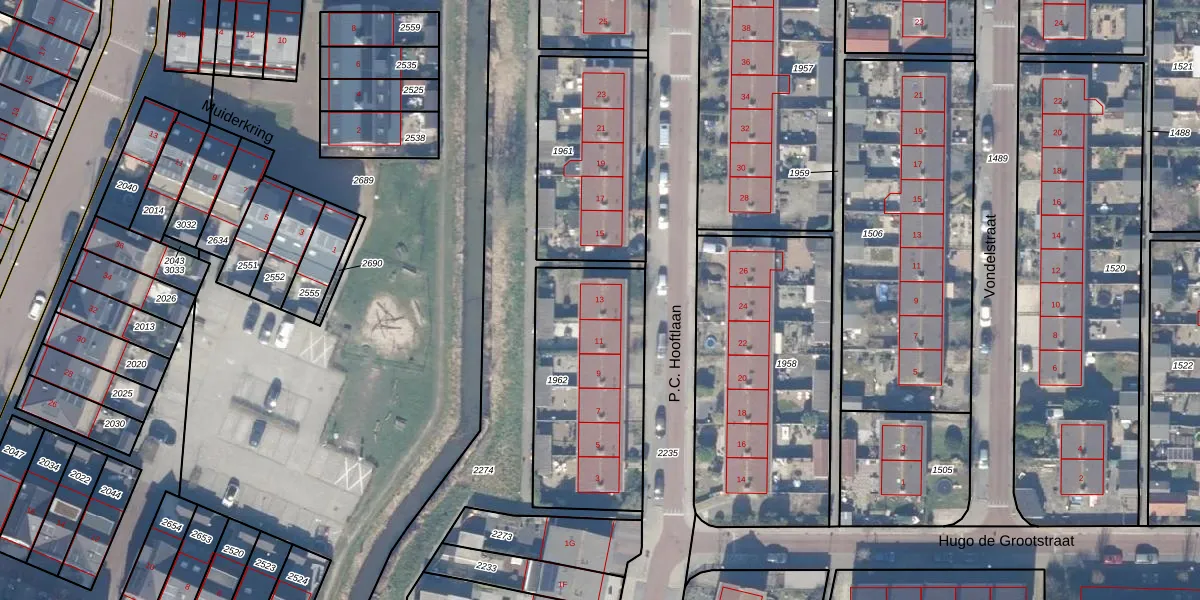 P.C. Hooftlaan 13 is gelegen op kadastraal perceel MDN01B1962. Deze kadastrale aanduiding is uniek en wordt gebruikt door het Kadaster om eigendomsrechten en andere zakelijke rechten vast te leggen. Het perceel maakt onderdeel uit van de kadastrale gemeente Muiden.
