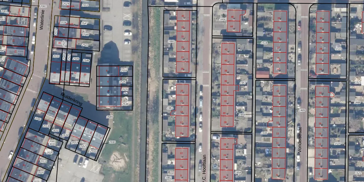 P.C. Hooftlaan 23 is gelegen op kadastraal perceel MDN01B1961. Deze kadastrale aanduiding is uniek en wordt gebruikt door het Kadaster om eigendomsrechten en andere zakelijke rechten vast te leggen. Het perceel maakt onderdeel uit van de kadastrale gemeente Muiden.