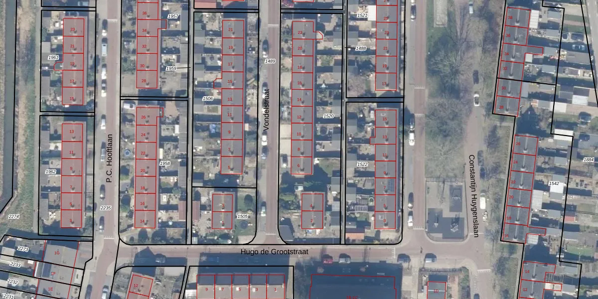 Het perceel waarop Vondelstraat 8 staat heeft een oppervlakte van 1600 m². Dit is een zeer groot perceel. De perceeloppervlakte wordt geregistreerd door het Kadaster. Gedetailleerde informatie over de maten van dit perceel kunt u vinden in het rapport Kadastrale kaart met maatvoering van Vondelstraat 8.