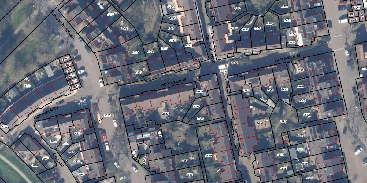 Het perceel waarop Horrewaarde 18 staat heeft een oppervlakte van 695 m². Dit is een groot perceel. De perceeloppervlakte wordt geregistreerd door het Kadaster. Gedetailleerde informatie over de maten van dit perceel kunt u vinden in het rapport Kadastrale kaart met maatvoering van Horrewaarde 18.