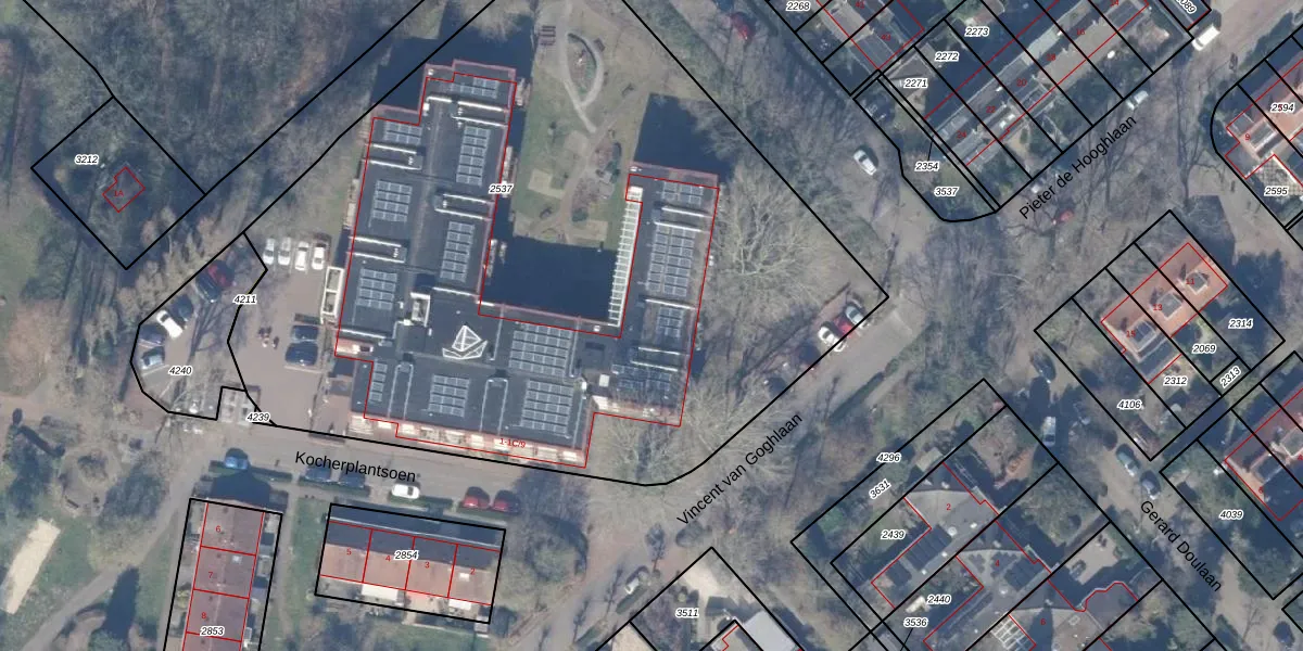 Het perceel waarop Kocherplantsoen 1-B-5 staat heeft een oppervlakte van 5105 m². Dit is een zeer groot perceel. De perceeloppervlakte wordt geregistreerd door het Kadaster. Gedetailleerde informatie over de maten van dit perceel kunt u vinden in het rapport Kadastrale kaart met maatvoering van Kocherplantsoen 1-B-5.