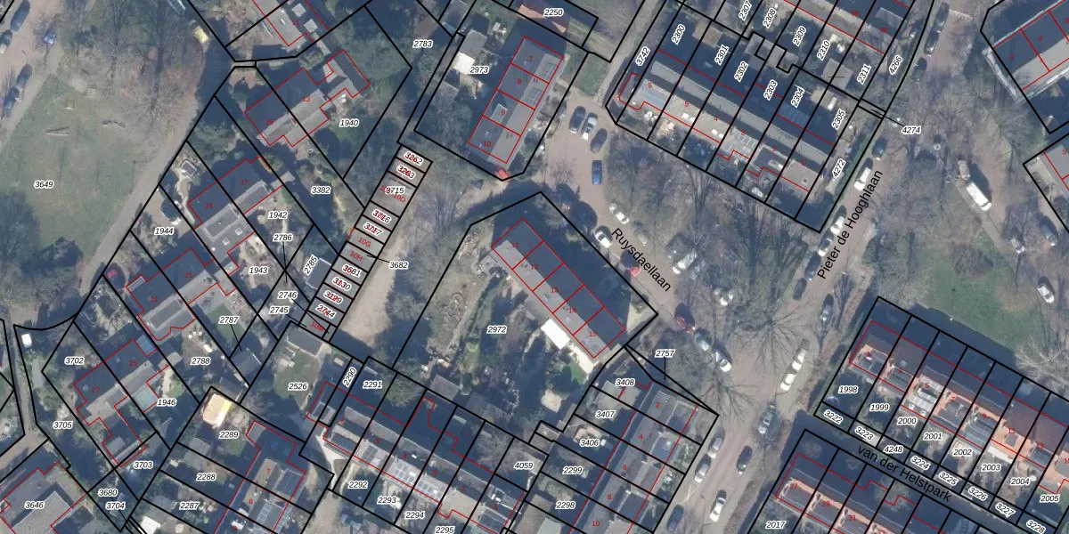 Het perceel waarop Ruysdaellaan 12 staat heeft een oppervlakte van 1320 m². Dit is een zeer groot perceel. De perceeloppervlakte wordt geregistreerd door het Kadaster. Gedetailleerde informatie over de maten van dit perceel kunt u vinden in het rapport Kadastrale kaart met maatvoering van Ruysdaellaan 12.