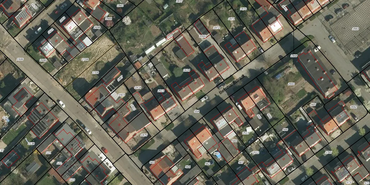 Het perceel waarop Bernhardstraat 16 staat heeft een oppervlakte van 876 m². Dit is een groot perceel. De perceeloppervlakte wordt geregistreerd door het Kadaster. Gedetailleerde informatie over de maten van dit perceel kunt u vinden in het rapport Kadastrale kaart met maatvoering van Bernhardstraat 16.