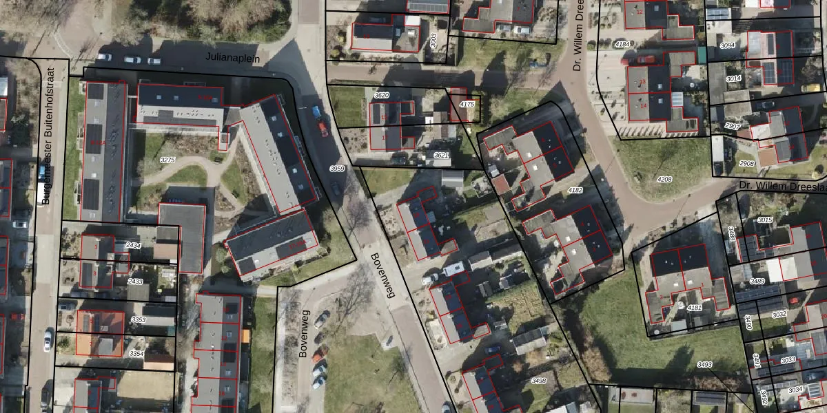 Het perceel waarop Bovenweg 19 staat heeft een oppervlakte van 2190 m². Dit is een zeer groot perceel. De perceeloppervlakte wordt geregistreerd door het Kadaster. Gedetailleerde informatie over de maten van dit perceel kunt u vinden in het rapport Kadastrale kaart met maatvoering van Bovenweg 19.
