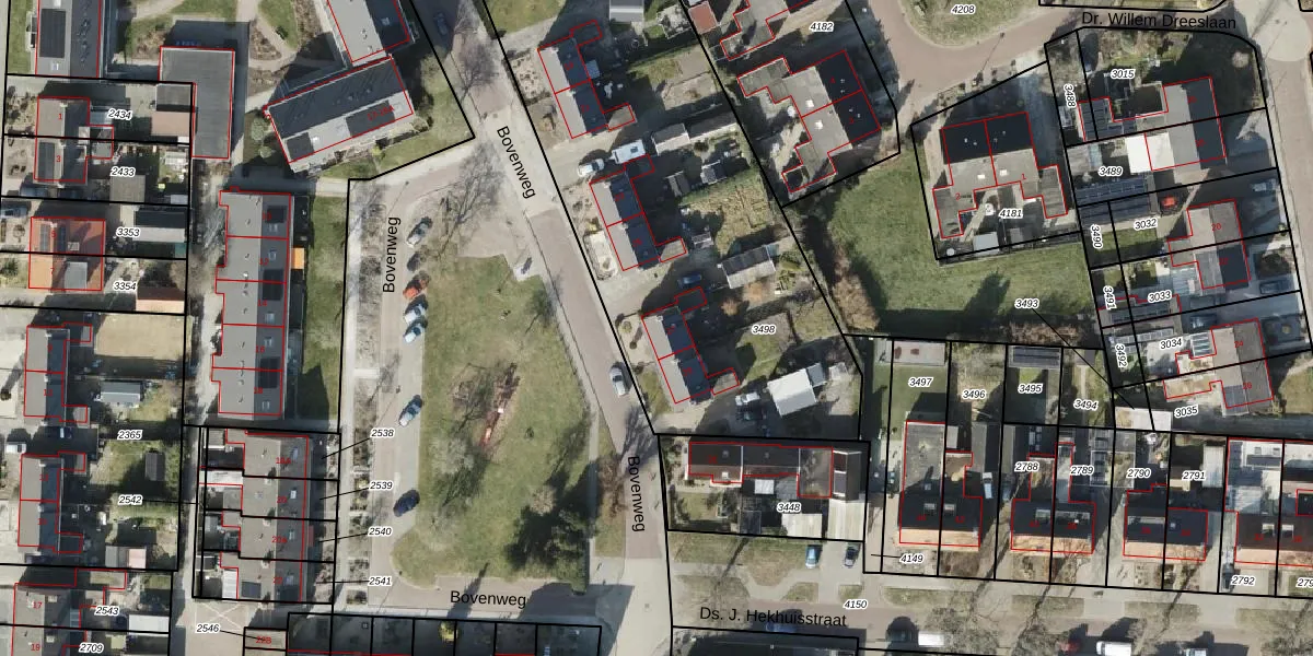 Het perceel waarop Bovenweg 27 staat heeft een oppervlakte van 2190 m². Dit is een zeer groot perceel. De perceeloppervlakte wordt geregistreerd door het Kadaster. Gedetailleerde informatie over de maten van dit perceel kunt u vinden in het rapport Kadastrale kaart met maatvoering van Bovenweg 27.