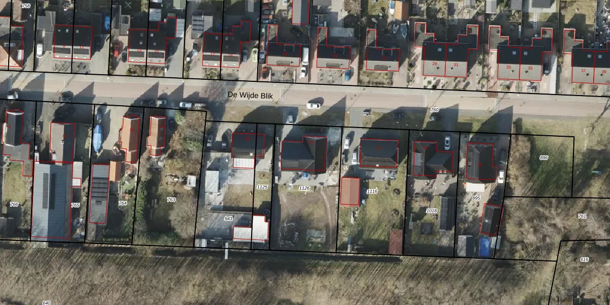 Het perceel waarop De Wijde Blik 20 staat heeft een oppervlakte van 910 m². Dit is een groot perceel. De perceeloppervlakte wordt geregistreerd door het Kadaster. Gedetailleerde informatie over de maten van dit perceel kunt u vinden in het rapport Kadastrale kaart met maatvoering van De Wijde Blik 20.