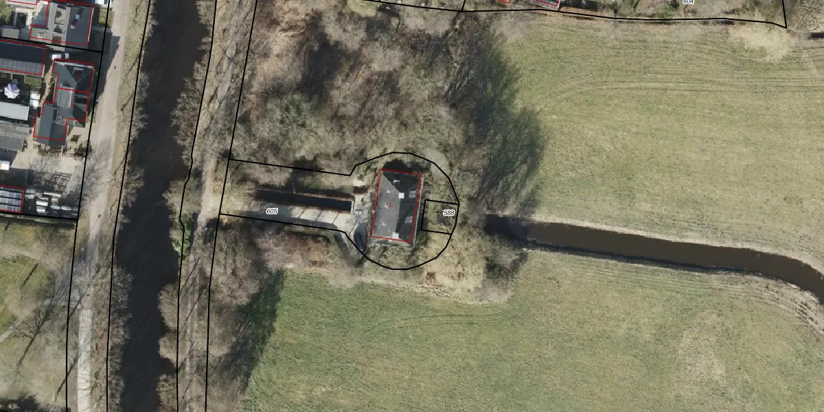 Het adres ligt op het perceel MTD01-E-605, dat zich in de kadastrale gemeente Muntendam bevindt. Het perceel is kleiner dan gemiddeld in Muntendam. Het perceel is 967 m² groot, terwijl het gemiddelde ligt op 7414,63 m². Het kleinste perceel in de kadastrale gemeente is 1 m² groot. De grootste perceeloppervlakte is 44,6 ha. Er zijn geen andere adressen aanwezig op het perceel. De laatste wijziging in het de Basisregistratie Kadaster (BRK) was op 31-03-2009.