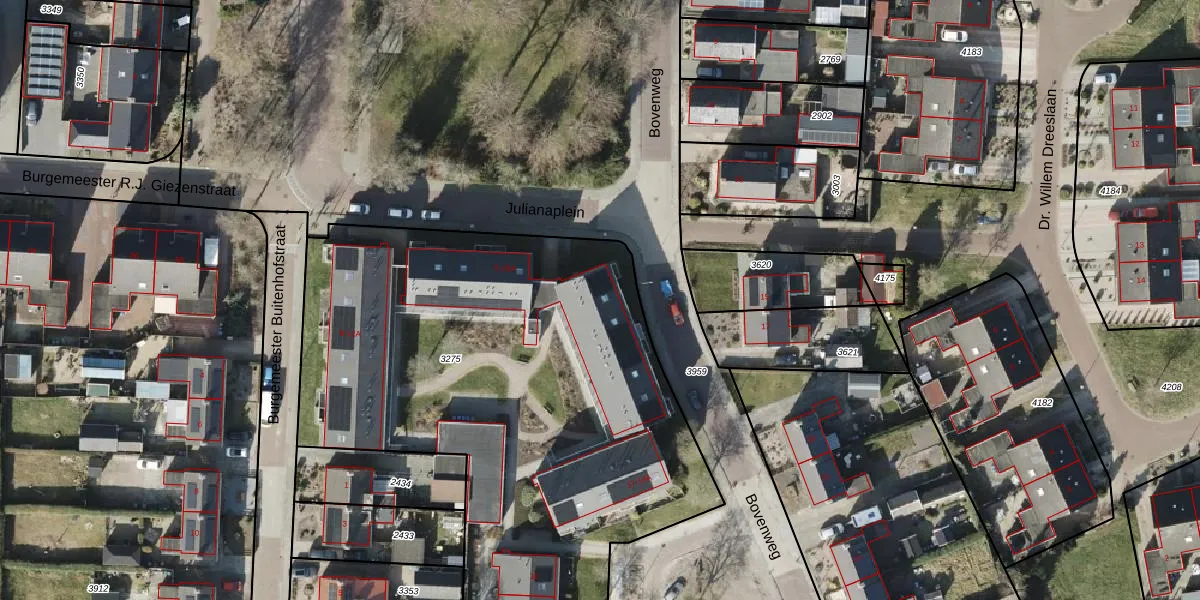 Het perceel waarop Julianaplein 13 staat heeft een oppervlakte van 3658 m². Dit is een zeer groot perceel. De perceeloppervlakte wordt geregistreerd door het Kadaster. Gedetailleerde informatie over de maten van dit perceel kunt u vinden in het rapport Kadastrale kaart met maatvoering van Julianaplein 13.