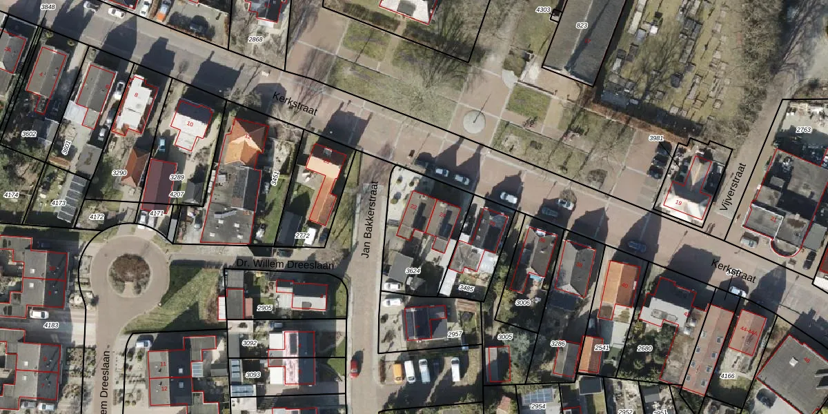 Het perceel waarop Kerkstraat 22 staat heeft een oppervlakte van 490 m². Dit is een groot perceel. De perceeloppervlakte wordt geregistreerd door het Kadaster. Gedetailleerde informatie over de maten van dit perceel kunt u vinden in het rapport Kadastrale kaart met maatvoering van Kerkstraat 22.
