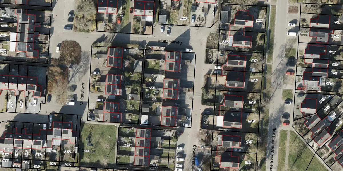 Het perceel waarop Multatuliweg 17 staat heeft een oppervlakte van 2566 m². Dit is een zeer groot perceel. De perceeloppervlakte wordt geregistreerd door het Kadaster. Gedetailleerde informatie over de maten van dit perceel kunt u vinden in het rapport Kadastrale kaart met maatvoering van Multatuliweg 17.