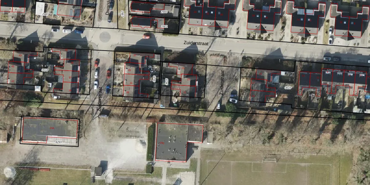 Het perceel waarop Zuiderstraat 21 staat heeft een oppervlakte van 434 m². Dit is een groot perceel. De perceeloppervlakte wordt geregistreerd door het Kadaster. Gedetailleerde informatie over de maten van dit perceel kunt u vinden in het rapport Kadastrale kaart met maatvoering van Zuiderstraat 21.