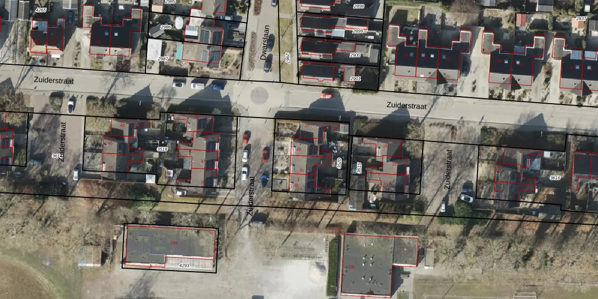 Het perceel waarop Zuiderstraat 29 staat heeft een oppervlakte van 603 m². Dit is een groot perceel. De perceeloppervlakte wordt geregistreerd door het Kadaster. Gedetailleerde informatie over de maten van dit perceel kunt u vinden in het rapport Kadastrale kaart met maatvoering van Zuiderstraat 29.