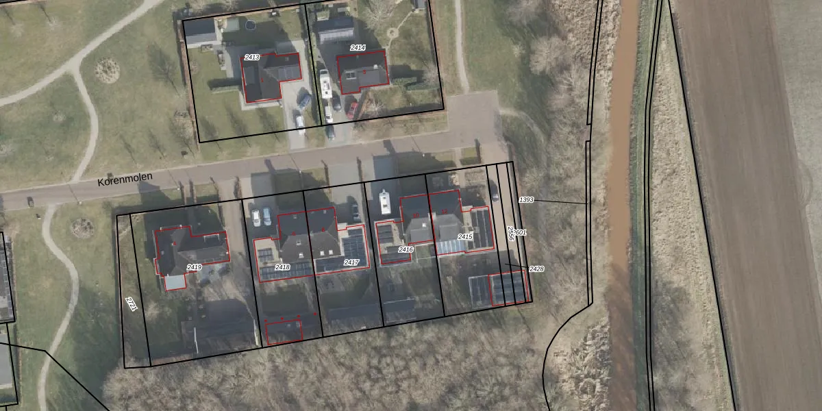 Het perceel waarop Korenmolen 10 staat heeft een oppervlakte van 530 m². Dit is een groot perceel. De perceeloppervlakte wordt geregistreerd door het Kadaster. Gedetailleerde informatie over de maten van dit perceel kunt u vinden in het rapport Kadastrale kaart met maatvoering van Korenmolen 10.