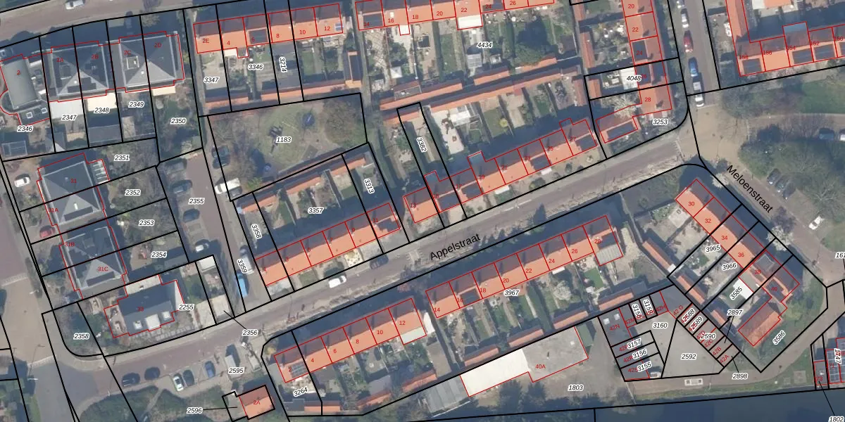 Het perceel waarop Appelstraat 13 staat heeft een oppervlakte van 3620 m². Dit is een zeer groot perceel. De perceeloppervlakte wordt geregistreerd door het Kadaster. Gedetailleerde informatie over de maten van dit perceel kunt u vinden in het rapport Kadastrale kaart met maatvoering van Appelstraat 13.