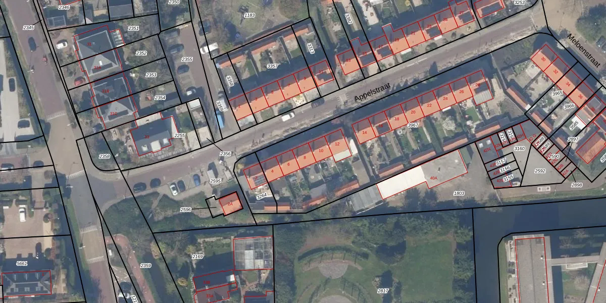 Het perceel waarop Appelstraat 8 staat heeft een oppervlakte van 2564 m². Dit is een zeer groot perceel. De perceeloppervlakte wordt geregistreerd door het Kadaster. Gedetailleerde informatie over de maten van dit perceel kunt u vinden in het rapport Kadastrale kaart met maatvoering van Appelstraat 8.