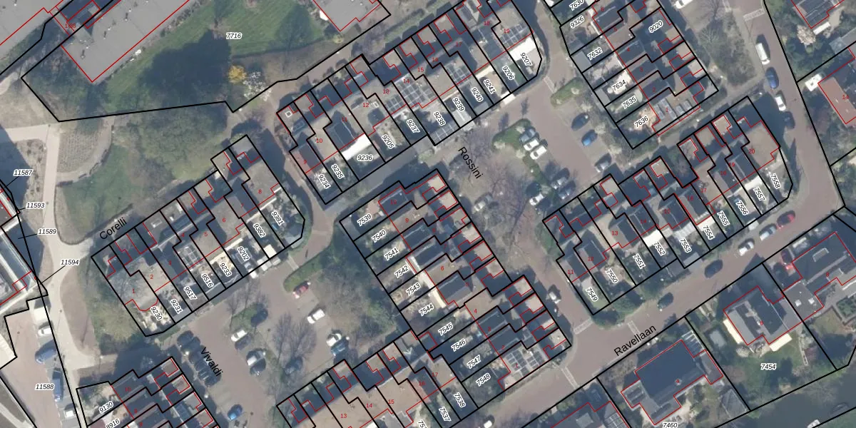 Het perceel waarop Rossini 9 staat heeft een oppervlakte van 124 m². Dit is een middelgroot perceel. De perceeloppervlakte wordt geregistreerd door het Kadaster. Gedetailleerde informatie over de maten van dit perceel kunt u vinden in het rapport Kadastrale kaart met maatvoering van Rossini 9.