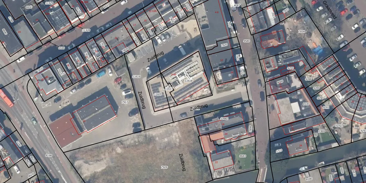 Het perceel waarop Zuidbrug 8 staat heeft een oppervlakte van 477 m². Dit is een groot perceel. De perceeloppervlakte wordt geregistreerd door het Kadaster. Gedetailleerde informatie over de maten van dit perceel kunt u vinden in het rapport Kadastrale kaart met maatvoering van Zuidbrug 8.