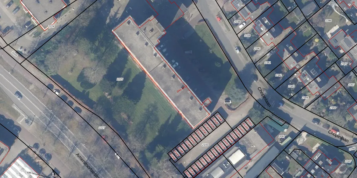 Het perceel waarop Chopinlaan 2-B1 staat heeft een oppervlakte van 8363 m². Dit is een zeer groot perceel. De perceeloppervlakte wordt geregistreerd door het Kadaster. Gedetailleerde informatie over de maten van dit perceel kunt u vinden in het rapport Kadastrale kaart met maatvoering van Chopinlaan 2-B1.