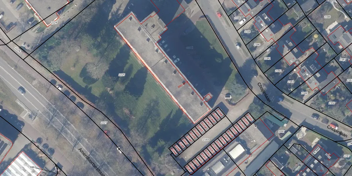 Het perceel waarop Chopinlaan 2-B5 staat heeft een oppervlakte van 8363 m². Dit is een zeer groot perceel. De perceeloppervlakte wordt geregistreerd door het Kadaster. Gedetailleerde informatie over de maten van dit perceel kunt u vinden in het rapport Kadastrale kaart met maatvoering van Chopinlaan 2-B5.