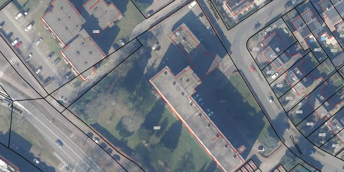 Het perceel waarop Chopinlaan 2-E6 staat heeft een oppervlakte van 8363 m². Dit is een zeer groot perceel. De perceeloppervlakte wordt geregistreerd door het Kadaster. Gedetailleerde informatie over de maten van dit perceel kunt u vinden in het rapport Kadastrale kaart met maatvoering van Chopinlaan 2-E6.
