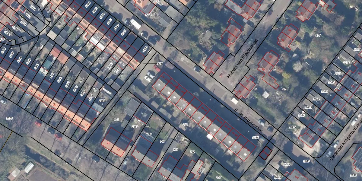 Het perceel waarop E. de Bruynstraat 10-C staat heeft een oppervlakte van 2150 m². Dit is een zeer groot perceel. De perceeloppervlakte wordt geregistreerd door het Kadaster. Gedetailleerde informatie over de maten van dit perceel kunt u vinden in het rapport Kadastrale kaart met maatvoering van E. de Bruynstraat 10-C.