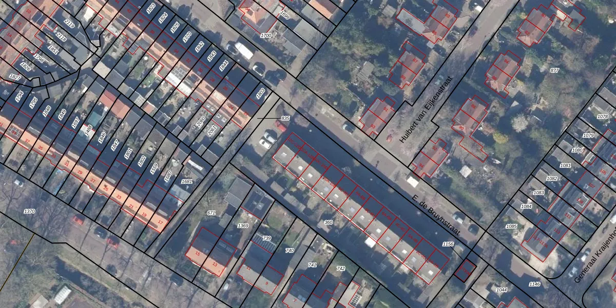 Het perceel waarop E. de Bruynstraat 12-A staat heeft een oppervlakte van 2150 m². Dit is een zeer groot perceel. De perceeloppervlakte wordt geregistreerd door het Kadaster. Gedetailleerde informatie over de maten van dit perceel kunt u vinden in het rapport Kadastrale kaart met maatvoering van E. de Bruynstraat 12-A.