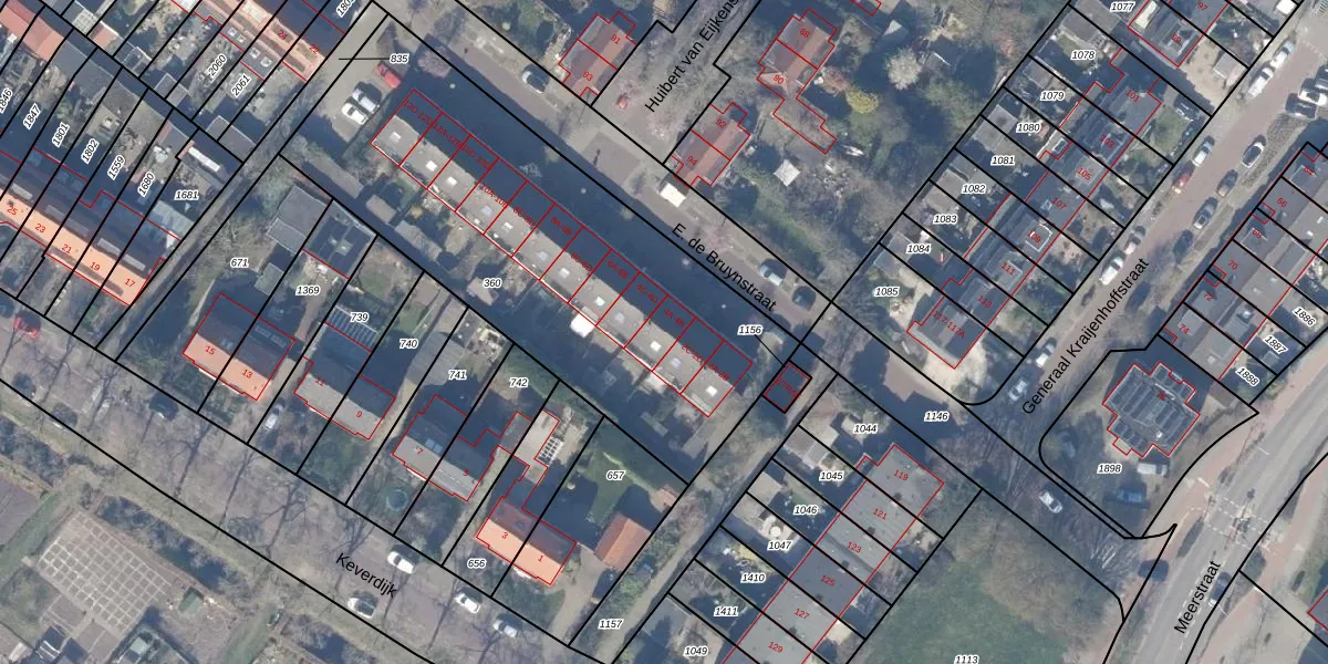 Het perceel waarop E. de Bruynstraat 4-B staat heeft een oppervlakte van 2150 m². Dit is een zeer groot perceel. De perceeloppervlakte wordt geregistreerd door het Kadaster. Gedetailleerde informatie over de maten van dit perceel kunt u vinden in het rapport Kadastrale kaart met maatvoering van E. de Bruynstraat 4-B.