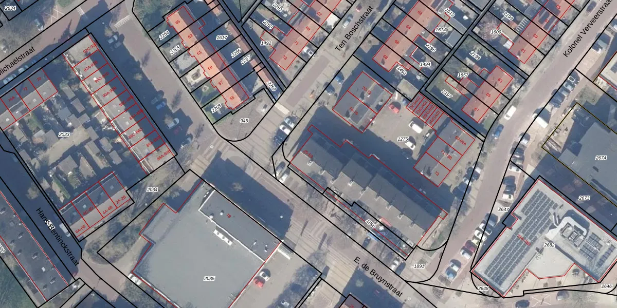 Het perceel waarop E. de Bruynstraat 53 staat heeft een oppervlakte van 2346 m². Dit is een zeer groot perceel. De perceeloppervlakte wordt geregistreerd door het Kadaster. Gedetailleerde informatie over de maten van dit perceel kunt u vinden in het rapport Kadastrale kaart met maatvoering van E. de Bruynstraat 53.