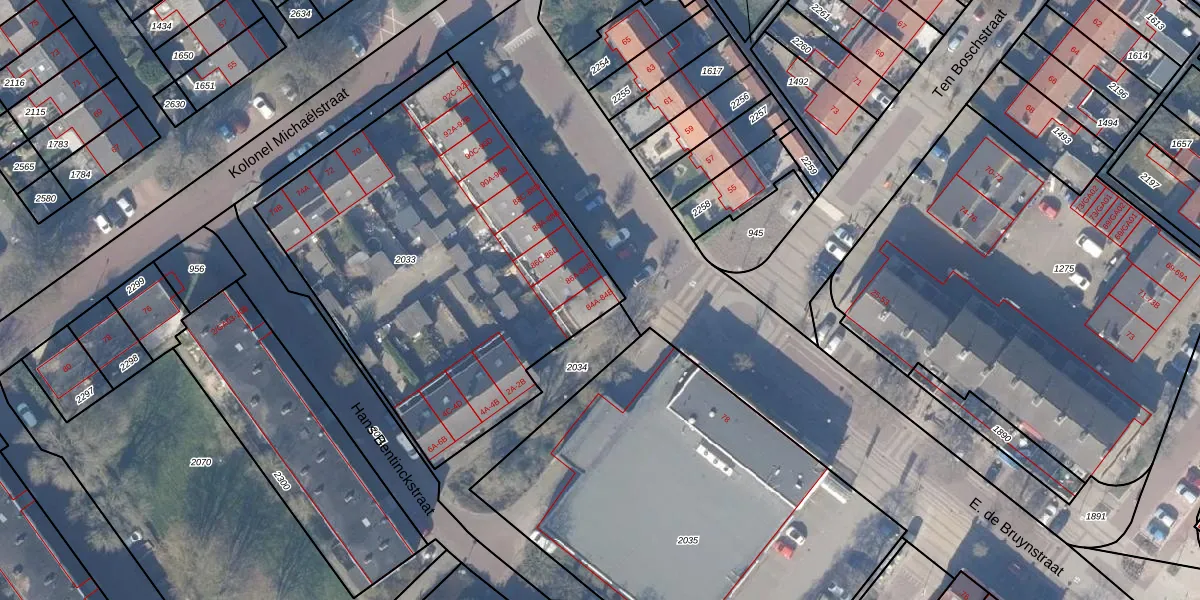 Het perceel waarop E. de Bruynstraat 84-A staat heeft een oppervlakte van 2205 m². Dit is een zeer groot perceel. De perceeloppervlakte wordt geregistreerd door het Kadaster. Gedetailleerde informatie over de maten van dit perceel kunt u vinden in het rapport Kadastrale kaart met maatvoering van E. de Bruynstraat 84-A.