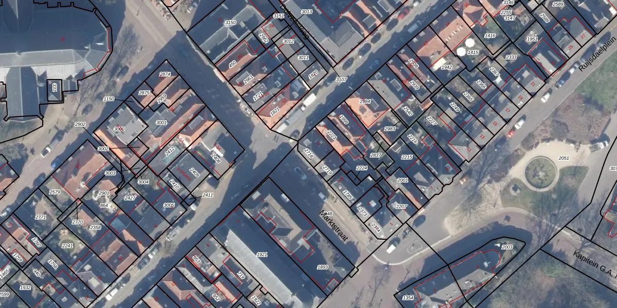 Het perceel waarop Marktstraat 10 staat heeft een oppervlakte van 91 m². Dit is een klein perceel. De perceeloppervlakte wordt geregistreerd door het Kadaster. Gedetailleerde informatie over de maten van dit perceel kunt u vinden in het rapport Kadastrale kaart met maatvoering van Marktstraat 10.