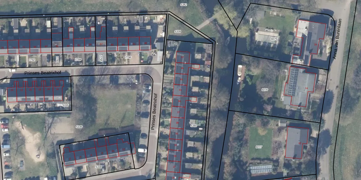 Het perceel waarop Prinses Beatrixhof 41 staat heeft een oppervlakte van 2150 m². Dit is een zeer groot perceel. De perceeloppervlakte wordt geregistreerd door het Kadaster. Gedetailleerde informatie over de maten van dit perceel kunt u vinden in het rapport Kadastrale kaart met maatvoering van Prinses Beatrixhof 41.