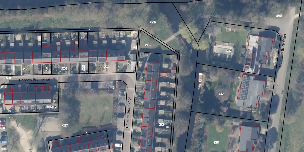 Het perceel waarop Prinses Beatrixhof 45 staat heeft een oppervlakte van 2150 m². Dit is een zeer groot perceel. De perceeloppervlakte wordt geregistreerd door het Kadaster. Gedetailleerde informatie over de maten van dit perceel kunt u vinden in het rapport Kadastrale kaart met maatvoering van Prinses Beatrixhof 45.