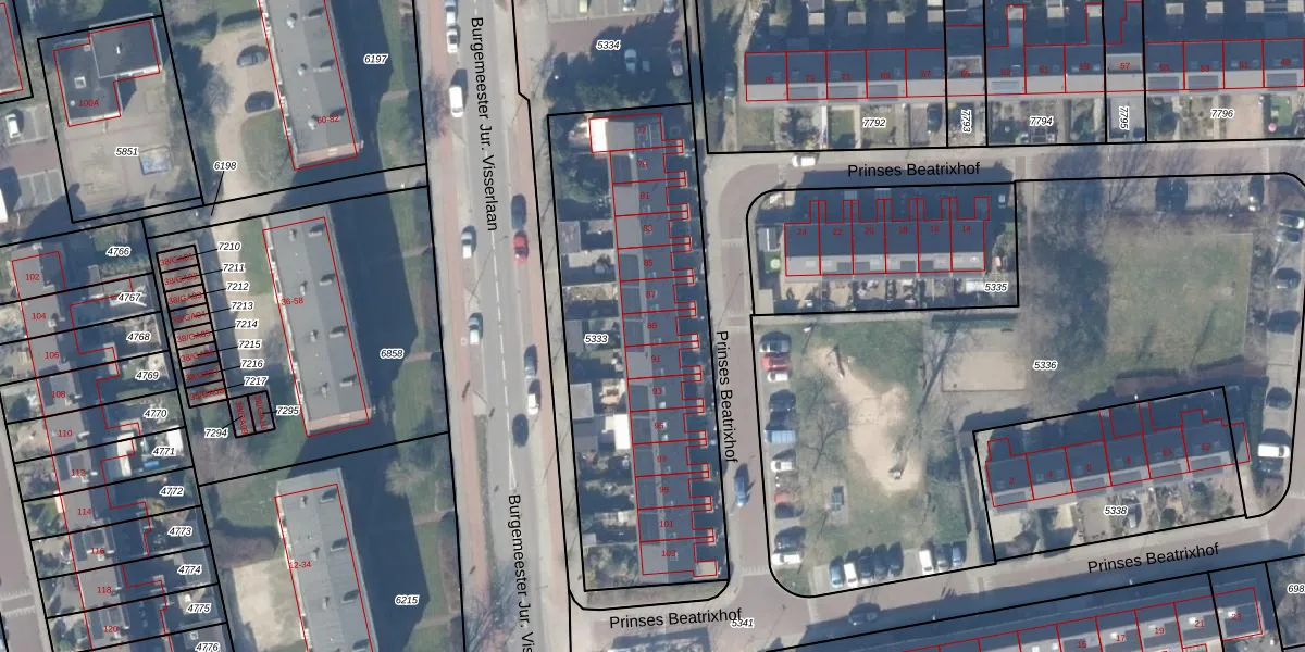 Het perceel waarop Prinses Beatrixhof 89 staat heeft een oppervlakte van 1615 m². Dit is een zeer groot perceel. De perceeloppervlakte wordt geregistreerd door het Kadaster. Gedetailleerde informatie over de maten van dit perceel kunt u vinden in het rapport Kadastrale kaart met maatvoering van Prinses Beatrixhof 89.
