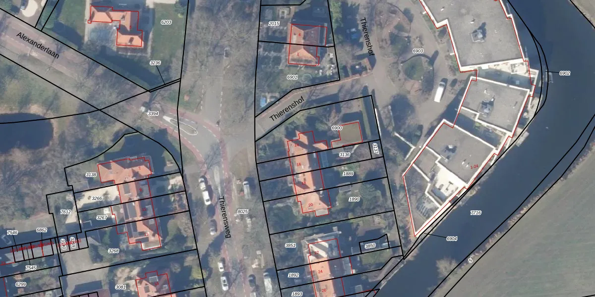 Het perceel waarop Thierensweg 14 staat heeft een oppervlakte van 530 m². Dit is een groot perceel. De perceeloppervlakte wordt geregistreerd door het Kadaster. Gedetailleerde informatie over de maten van dit perceel kunt u vinden in het rapport Kadastrale kaart met maatvoering van Thierensweg 14.