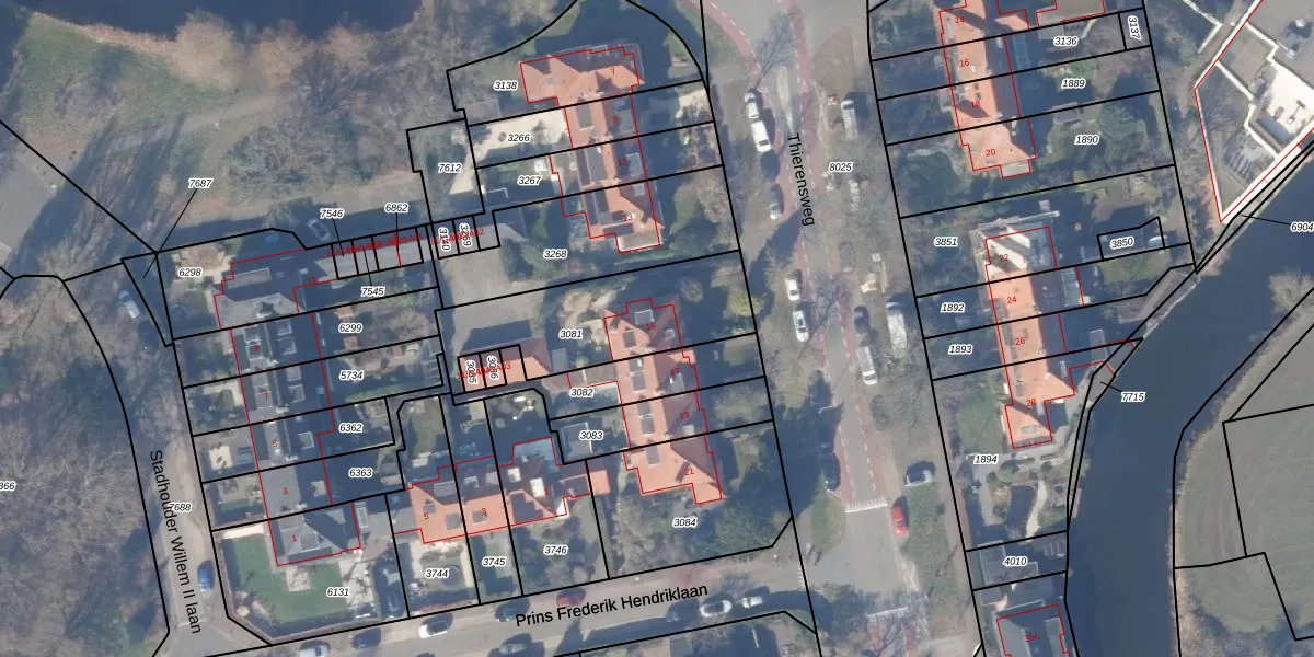 Het perceel waarop Thierensweg 15 staat heeft een oppervlakte van 571 m². Dit is een groot perceel. De perceeloppervlakte wordt geregistreerd door het Kadaster. Gedetailleerde informatie over de maten van dit perceel kunt u vinden in het rapport Kadastrale kaart met maatvoering van Thierensweg 15.