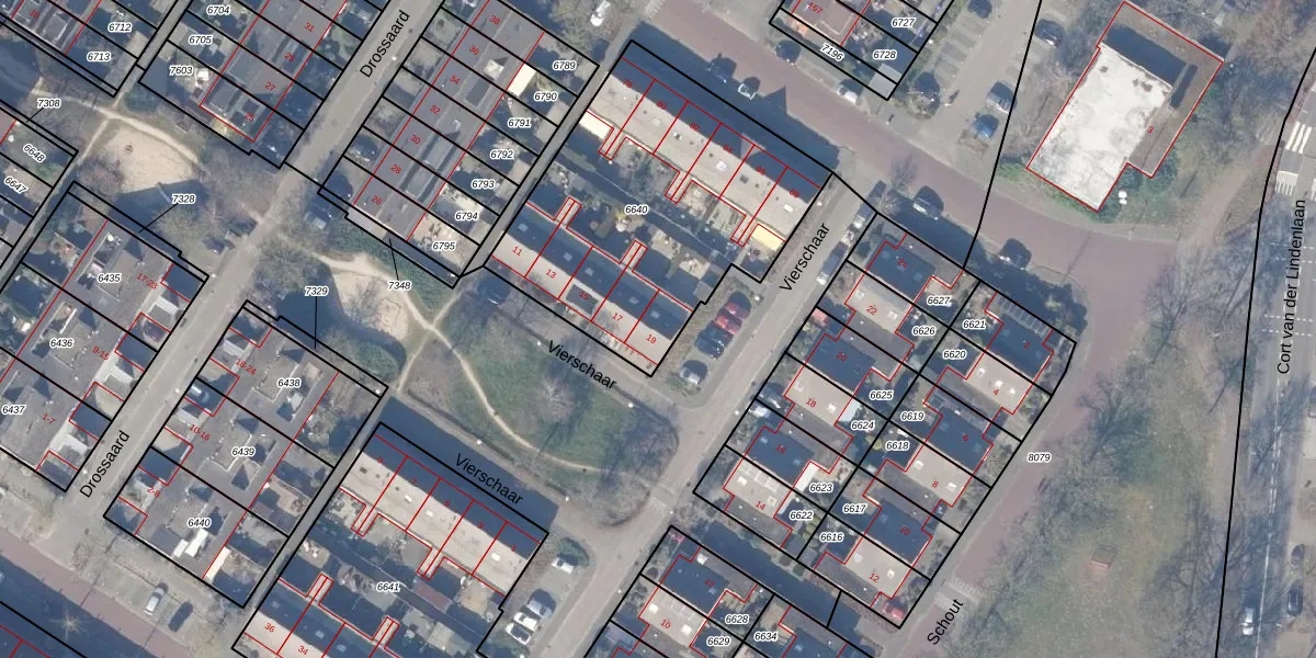 Het perceel waarop Vierschaar 19 staat heeft een oppervlakte van 1384 m². Dit is een zeer groot perceel. De perceeloppervlakte wordt geregistreerd door het Kadaster. Gedetailleerde informatie over de maten van dit perceel kunt u vinden in het rapport Kadastrale kaart met maatvoering van Vierschaar 19.