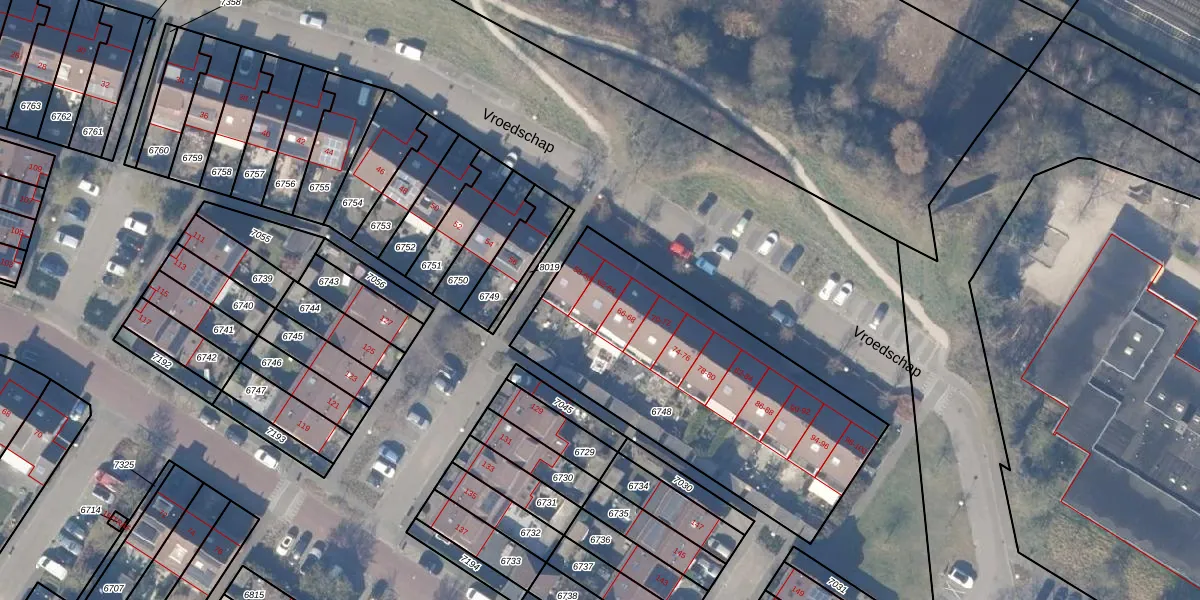 Het perceel waarop Vroedschap 64 staat heeft een oppervlakte van 1425 m². Dit is een zeer groot perceel. De perceeloppervlakte wordt geregistreerd door het Kadaster. Gedetailleerde informatie over de maten van dit perceel kunt u vinden in het rapport Kadastrale kaart met maatvoering van Vroedschap 64.