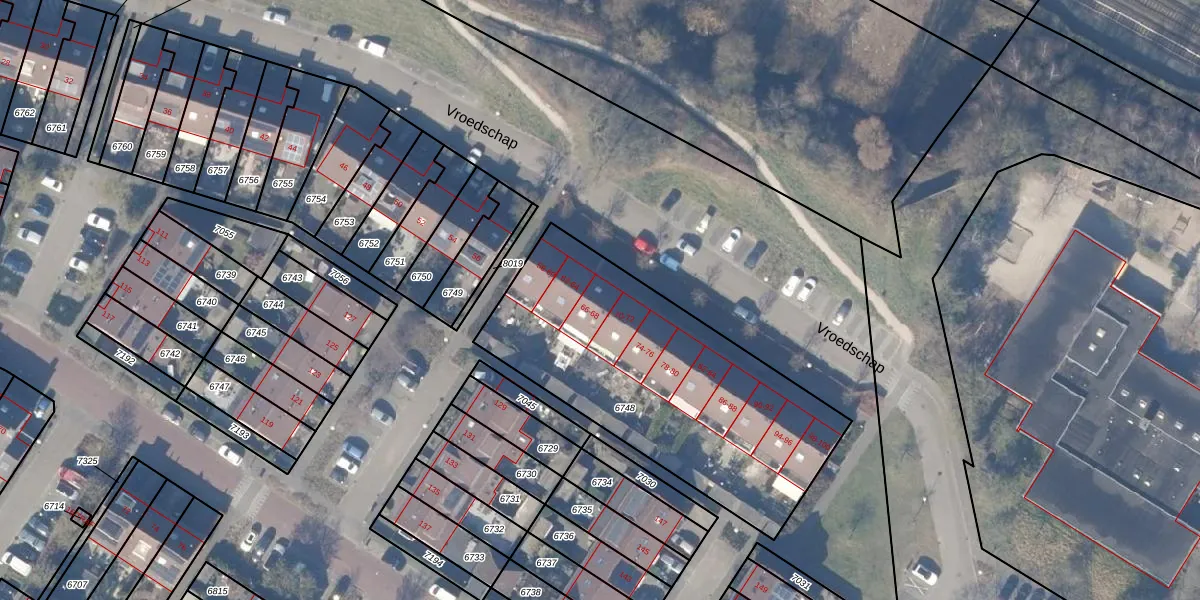 Het perceel waarop Vroedschap 66 staat heeft een oppervlakte van 1425 m². Dit is een zeer groot perceel. De perceeloppervlakte wordt geregistreerd door het Kadaster. Gedetailleerde informatie over de maten van dit perceel kunt u vinden in het rapport Kadastrale kaart met maatvoering van Vroedschap 66.