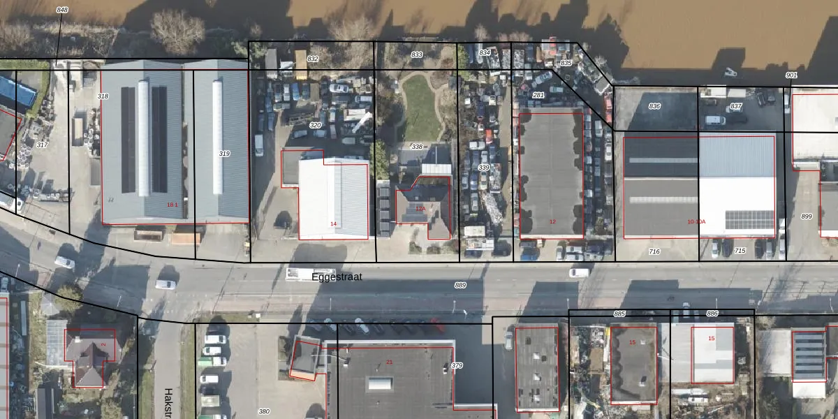 Het perceel waarop Eggestraat 12-A staat heeft een oppervlakte van 912 m². Dit is een groot perceel. De perceeloppervlakte wordt geregistreerd door het Kadaster. Gedetailleerde informatie over de maten van dit perceel kunt u vinden in het rapport Kadastrale kaart met maatvoering van Eggestraat 12-A.