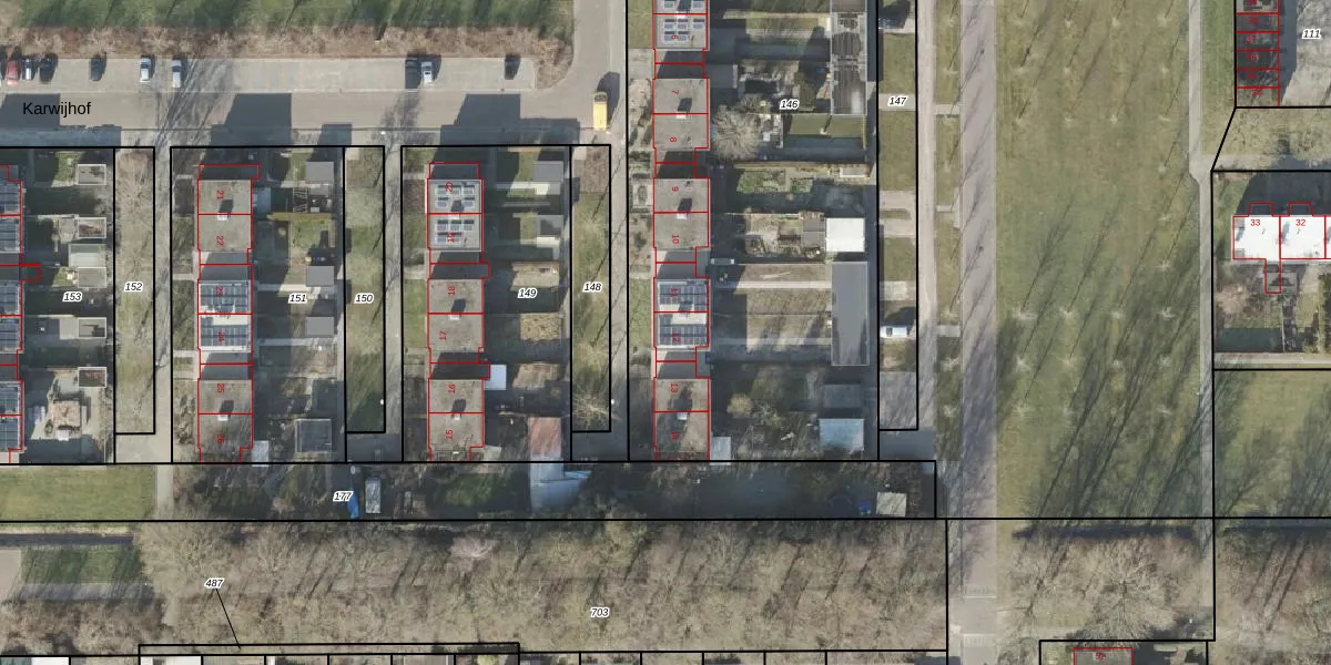 Het perceel waarop Karwijhof 12 staat heeft een oppervlakte van 3938 m². Dit is een zeer groot perceel. De perceeloppervlakte wordt geregistreerd door het Kadaster. Gedetailleerde informatie over de maten van dit perceel kunt u vinden in het rapport Kadastrale kaart met maatvoering van Karwijhof 12.