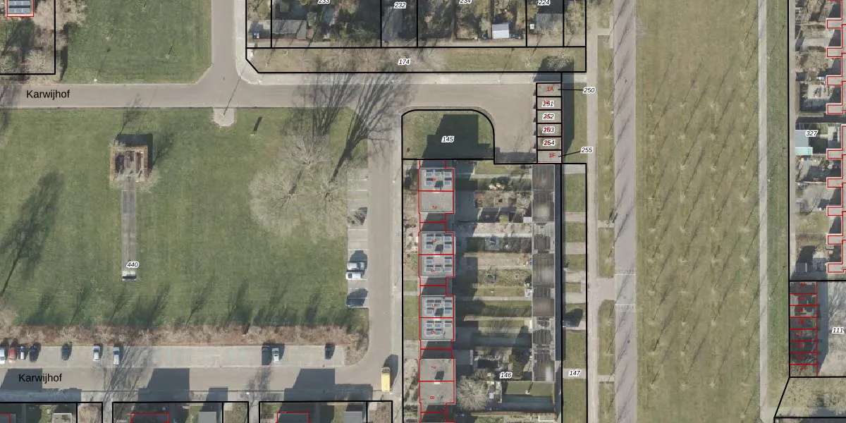 Het perceel waarop Karwijhof 2 staat heeft een oppervlakte van 3938 m². Dit is een zeer groot perceel. De perceeloppervlakte wordt geregistreerd door het Kadaster. Gedetailleerde informatie over de maten van dit perceel kunt u vinden in het rapport Kadastrale kaart met maatvoering van Karwijhof 2.