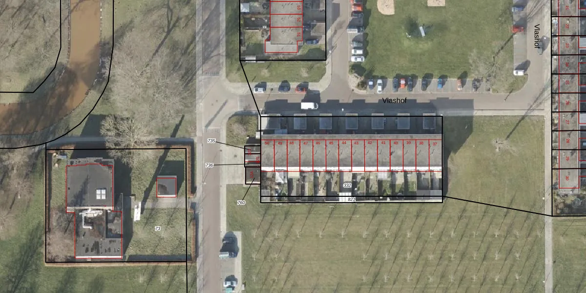Het perceel waarop Vlashof 48 staat heeft een oppervlakte van 1690 m². Dit is een zeer groot perceel. De perceeloppervlakte wordt geregistreerd door het Kadaster. Gedetailleerde informatie over de maten van dit perceel kunt u vinden in het rapport Kadastrale kaart met maatvoering van Vlashof 48.