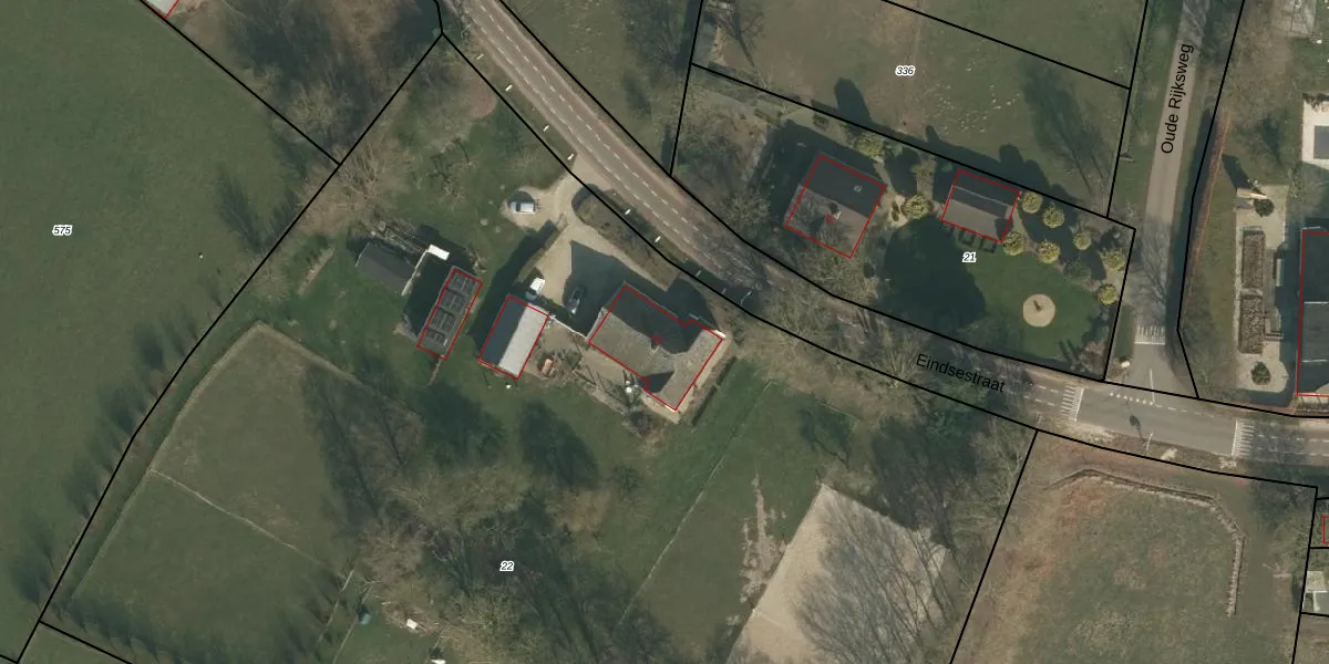 Het perceel waarop Eindsestraat 23 staat heeft een oppervlakte van 1,1 ha. Dit is een zeer groot perceel. De perceeloppervlakte wordt geregistreerd door het Kadaster. Gedetailleerde informatie over de maten van dit perceel kunt u vinden in het rapport Kadastrale kaart met maatvoering van Eindsestraat 23.