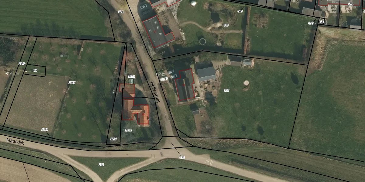 Het perceel waarop Maasdijk 15 staat heeft een oppervlakte van 3365 m². Dit is een zeer groot perceel. De perceeloppervlakte wordt geregistreerd door het Kadaster. Gedetailleerde informatie over de maten van dit perceel kunt u vinden in het rapport Kadastrale kaart met maatvoering van Maasdijk 15.