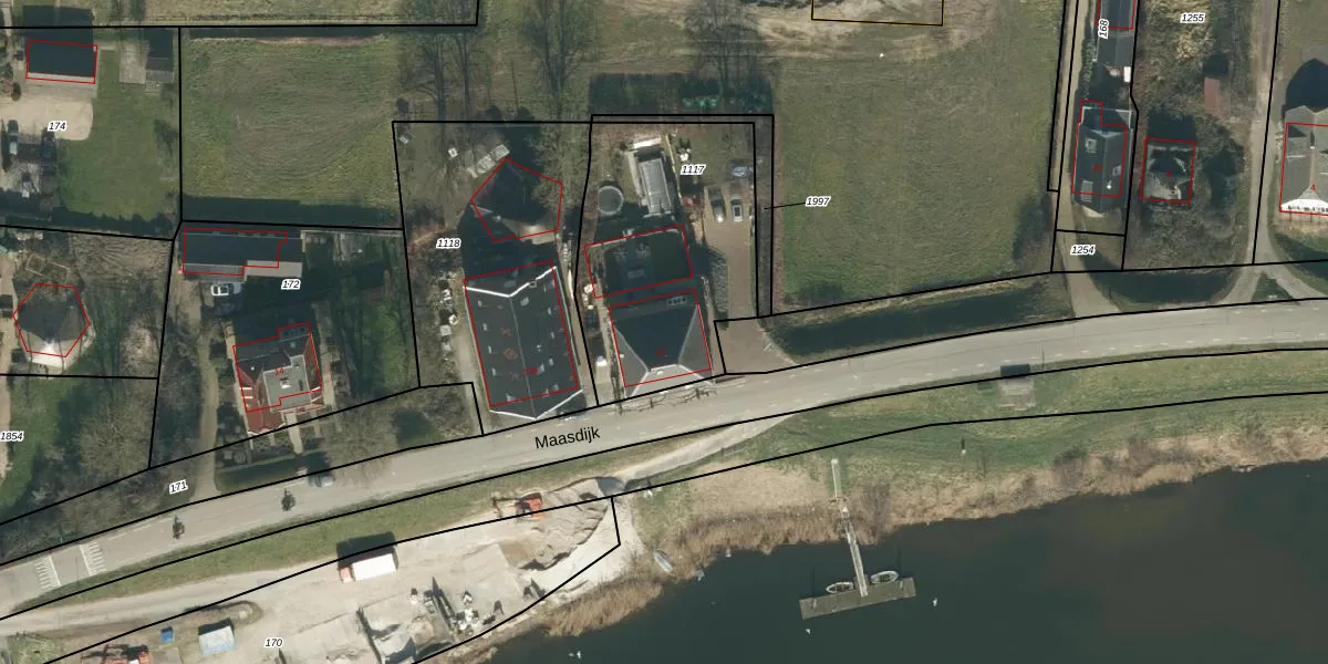Het perceel waarop Maasdijk 12 staat heeft een oppervlakte van 1015 m². Dit is een zeer groot perceel. De perceeloppervlakte wordt geregistreerd door het Kadaster. Gedetailleerde informatie over de maten van dit perceel kunt u vinden in het rapport Kadastrale kaart met maatvoering van Maasdijk 12.