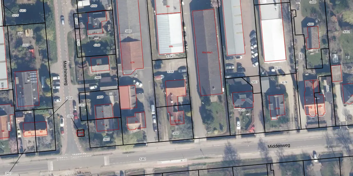 Het perceel waarop Middenweg 99-i staat heeft een oppervlakte van 532 m². Dit is een groot perceel. De perceeloppervlakte wordt geregistreerd door het Kadaster. Gedetailleerde informatie over de maten van dit perceel kunt u vinden in het rapport Kadastrale kaart met maatvoering van Middenweg 99-i.